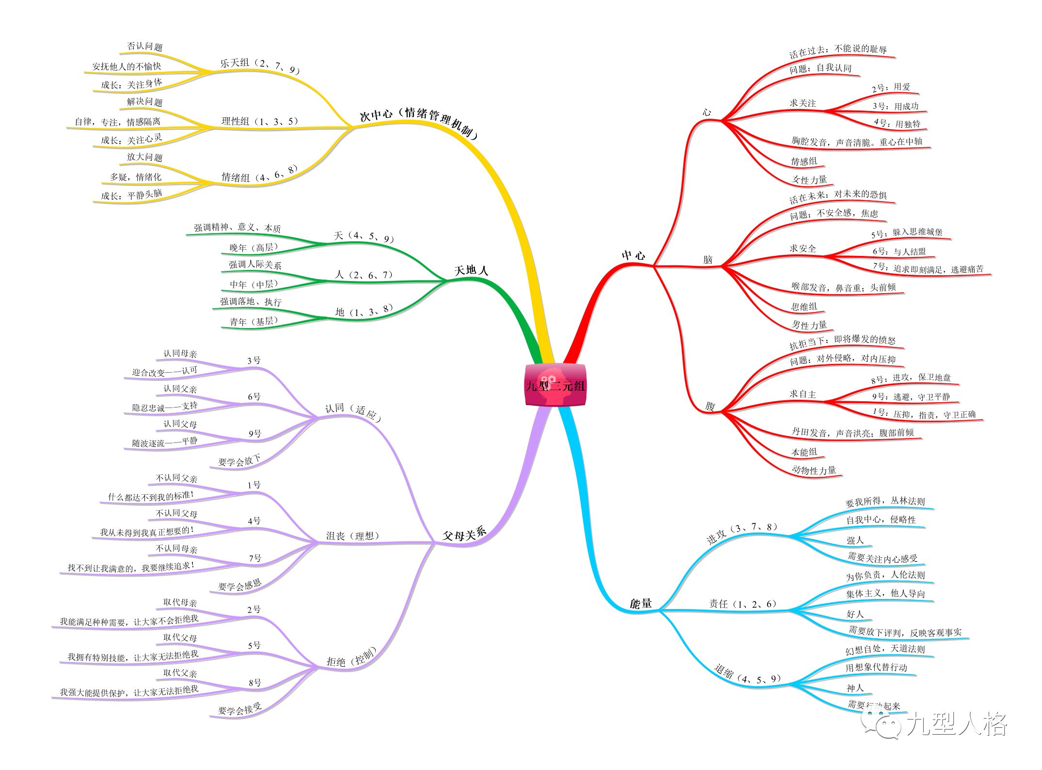 九型人格以三元素三件套成组,每一个三件套包含九型人格的三种元素。每一个都代表了不同的智力中心。脑区(567),心区(234),腹区(891).在人类的自然本性中,我们运用所有的三个中心但是趋向于过度运用三个中心的其中一个中心。在我们过度运用的那个中心里,一个人可能会过度运用三个元素中的其中一个。这就是一个人的九型人格的主导的型号。