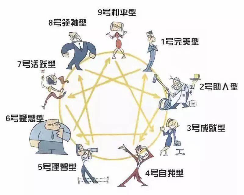 在九型人格中将人分为9种类型,分别是1号完美型、2号助人型、3号成就型、4号自我型、5号理智型、6号疑惑型、7号活跃型、8号领袖型、9号和平型。每一种类型的人,在内在价值观念、行为风格上有很大的不同。