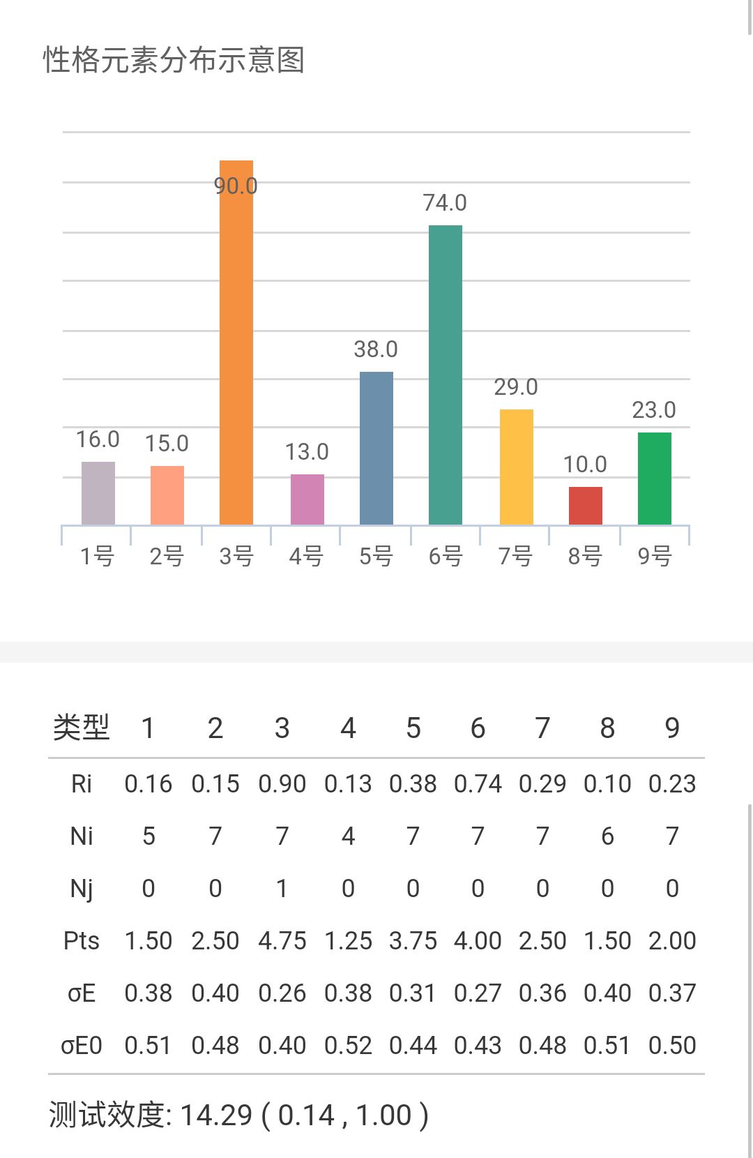 本次测试效度为14.29,其实并不高,考虑到柱状图高低起伏有很好的区分度,通过阅读报告里边的文字,其描述与本人非常相符,这次测试也是正常有效的。